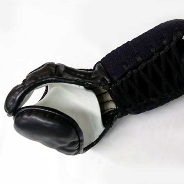 右手の甲手は、あまり使用していないきれいな状態ですが、左手甲手は使用感があります。またどちらも外側のレザーにはがれが一部あります。詳細写真をご確認ください。しっかりとした作りなのでまだ使用できます。当社にて除菌クリーニング済です。道場の体験用・お試し・予備用としても使えます。 サイズ:掌を一周した長さ-14.50cm S/Mサイズです。 甲手布団:7ミリ刺(ミシン縫いの刺し幅のことです) 頭部分:黒レザー 打突部:紺反/黒レザー張 手の内:白クラリーノ製 生子(なまこ):一段