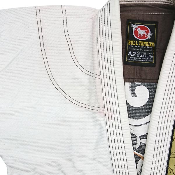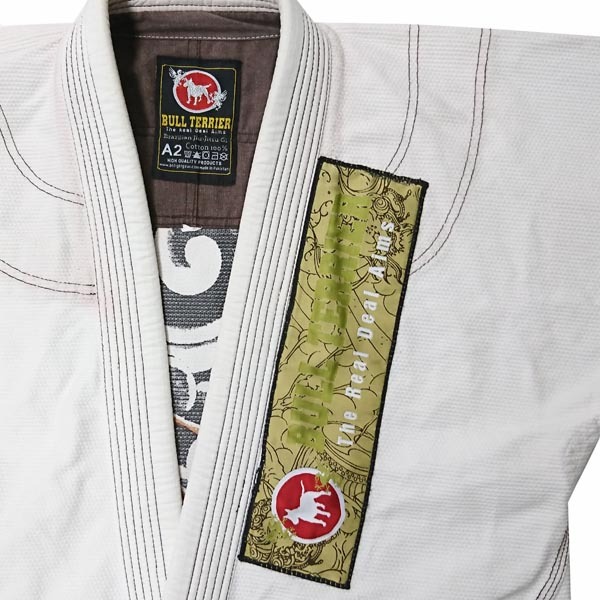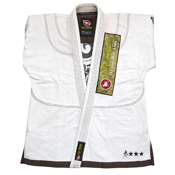 BULLTERRIER柔術衣 風神雷神モデル 上下 色:白 White 素材:綿100% サイズ:A2 所々に色染み、色褪せ、染移り、擦れが見られますが、大きなダメージはありません。パッチの縫製に補強箇所があります。 洗濯済みです。 オリジナル道着袋が付いています。(帯は含まれません。) 【平置き実寸】上衣-胸幅:約57cm着丈:約76cm裄:約83cm袖口幅:約16cm ズボン-ウエスト幅約52cmズボン丈約100cm股下約69cm ※返品・交換はできません。