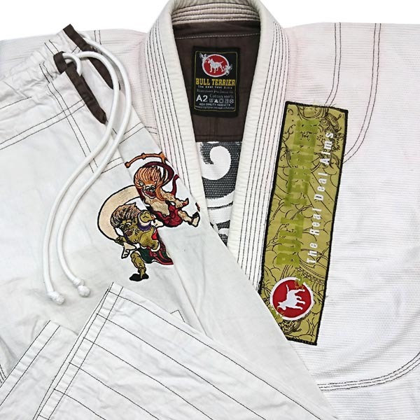 BULLTERRIER柔術衣 風神雷神モデル 上下 色:白 White 素材:綿100% サイズ:A2 所々に色染み、色褪せ、染移り、擦れが見られますが、大きなダメージはありません。パッチの縫製に補強箇所があります。 洗濯済みです。 オリジナル道着袋が付いています。(帯は含まれません。) 【平置き実寸】上衣-胸幅:約57cm着丈:約76cm裄:約83cm袖口幅:約16cm ズボン-ウエスト幅約52cmズボン丈約100cm股下約69cm ※返品・交換はできません。